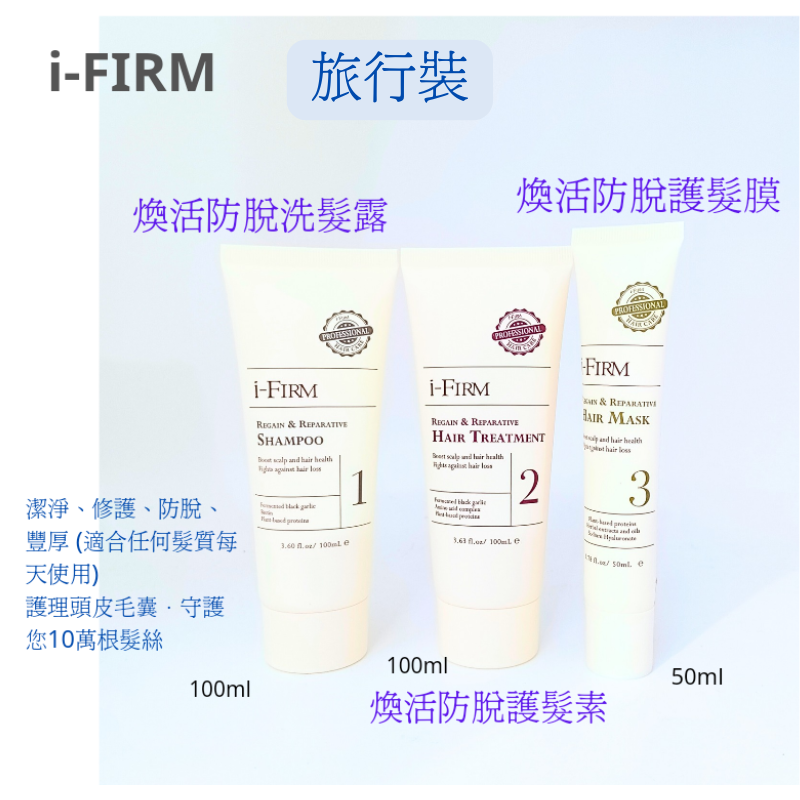 i-Firm Regain & Reparative Hair Treatment 煥活防脫護髮素 100 ml x1 Regain & Reparative Hair Mask 煥活防脫護髮膜 50ml x 1 Regain & Reparative Shampoo 煥活防脫洗髮露 100 ml x 1 一套三件